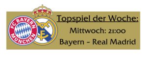 Montag: 21:00 Real Madrid – Getafe; Dienstag: 21:15 Wolverhampton – Liverpool; Mittwoch: 20:30 HSV – Leverkusen; Donnerstag: 21:00 Tottenham – Chrystal Palace; Freitag: 18:30 Konferenz 2. Liga; 20:30 Bayern – Gladbach; Samstag: 15:30 Bundesliga Konferenz; 18:30; Köln – Dortmund; Sonntag: 13:30 Münster – Hertha; 17:30 Union – Werder